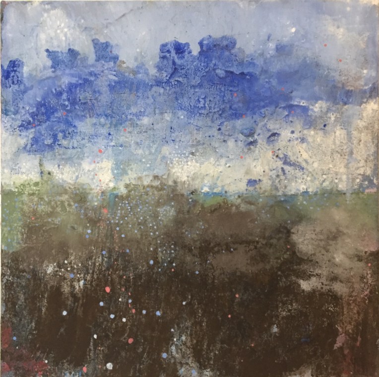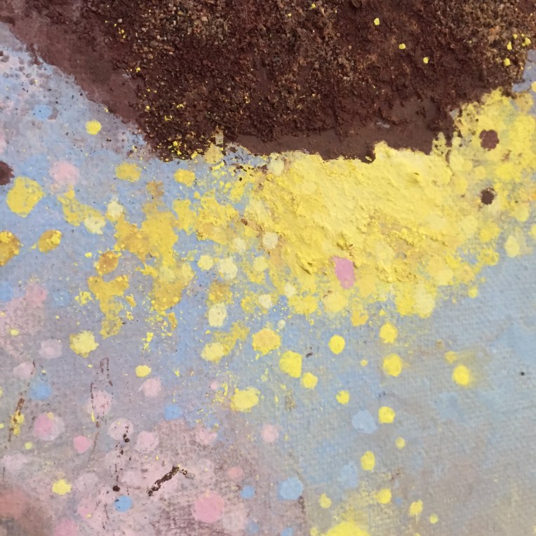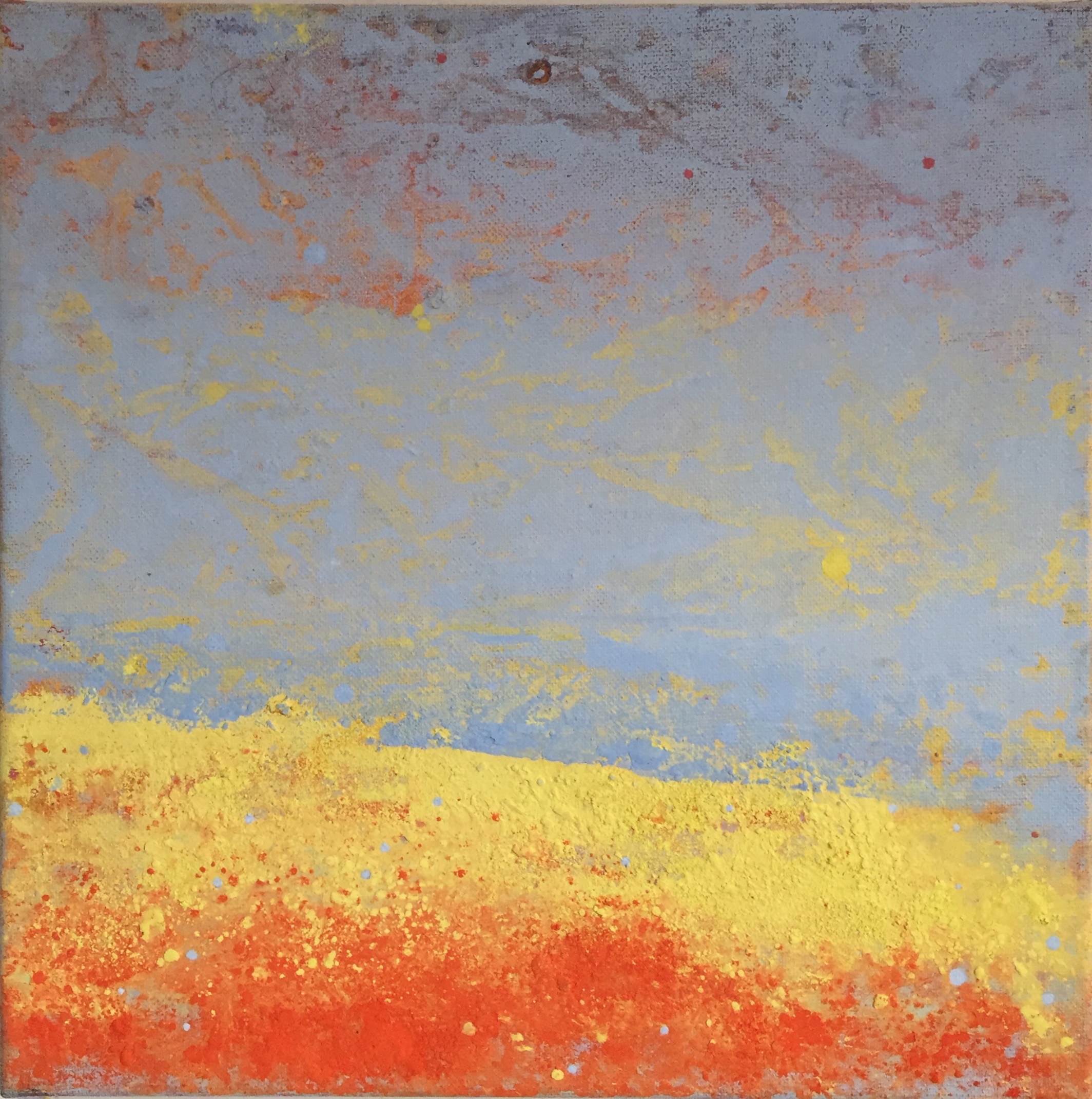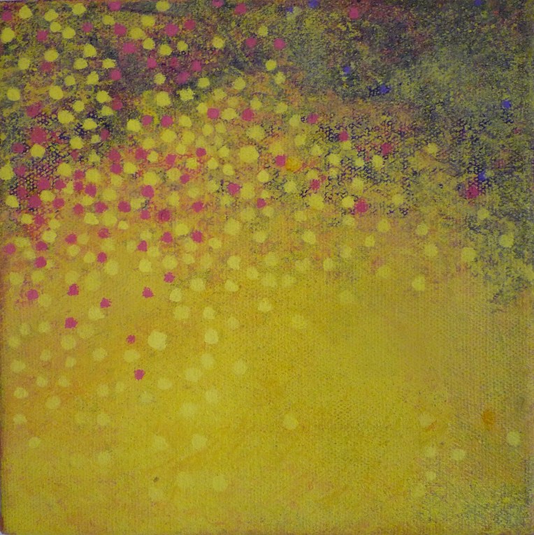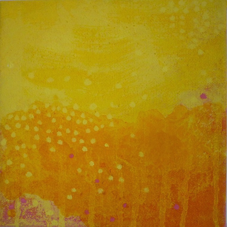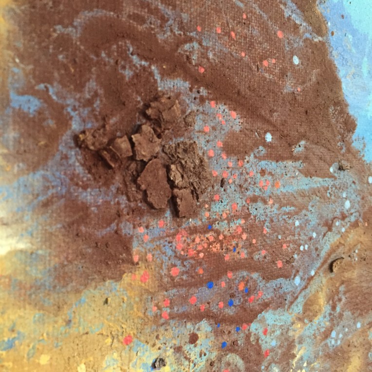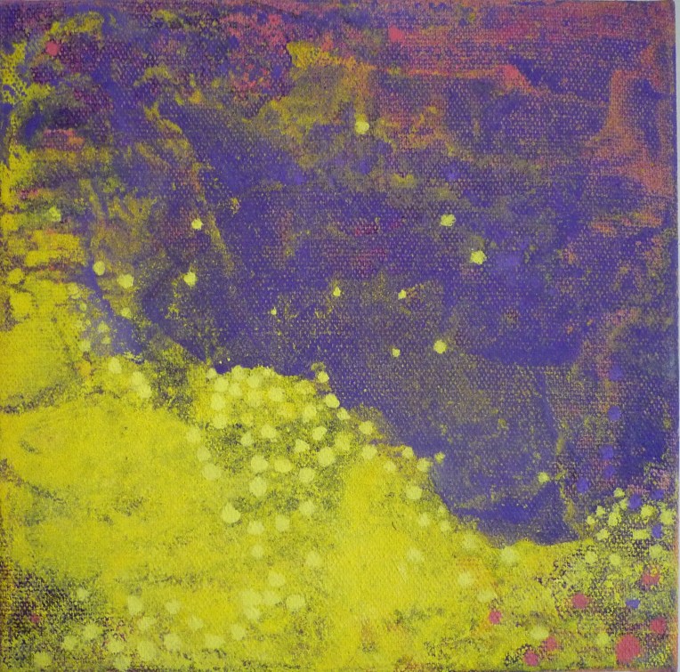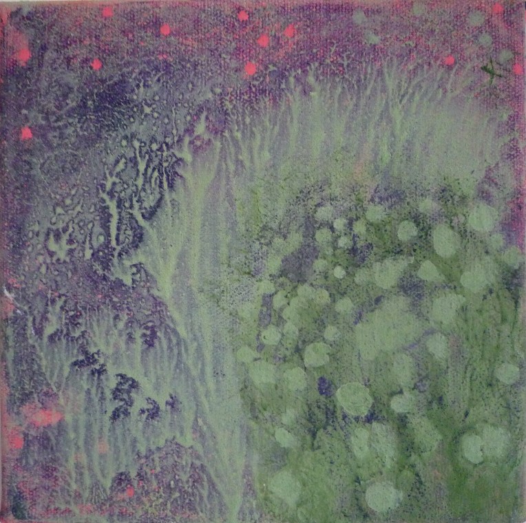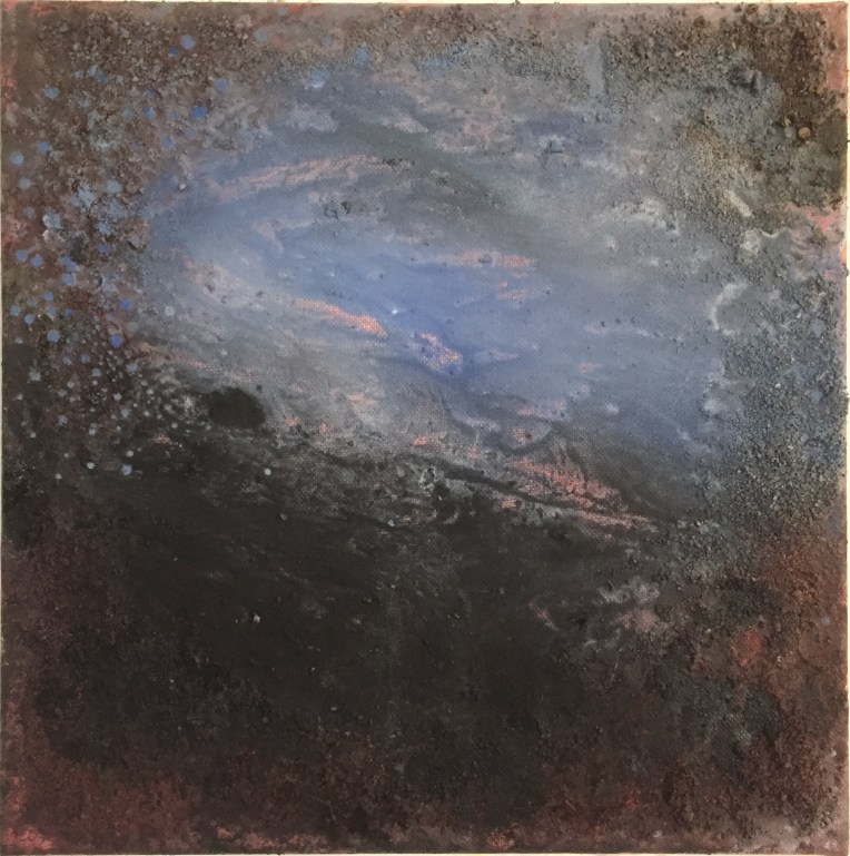 Tröst, 40×40 cm. Sand och frö av stickors i färgen. Målningen gör sig bra liggande.