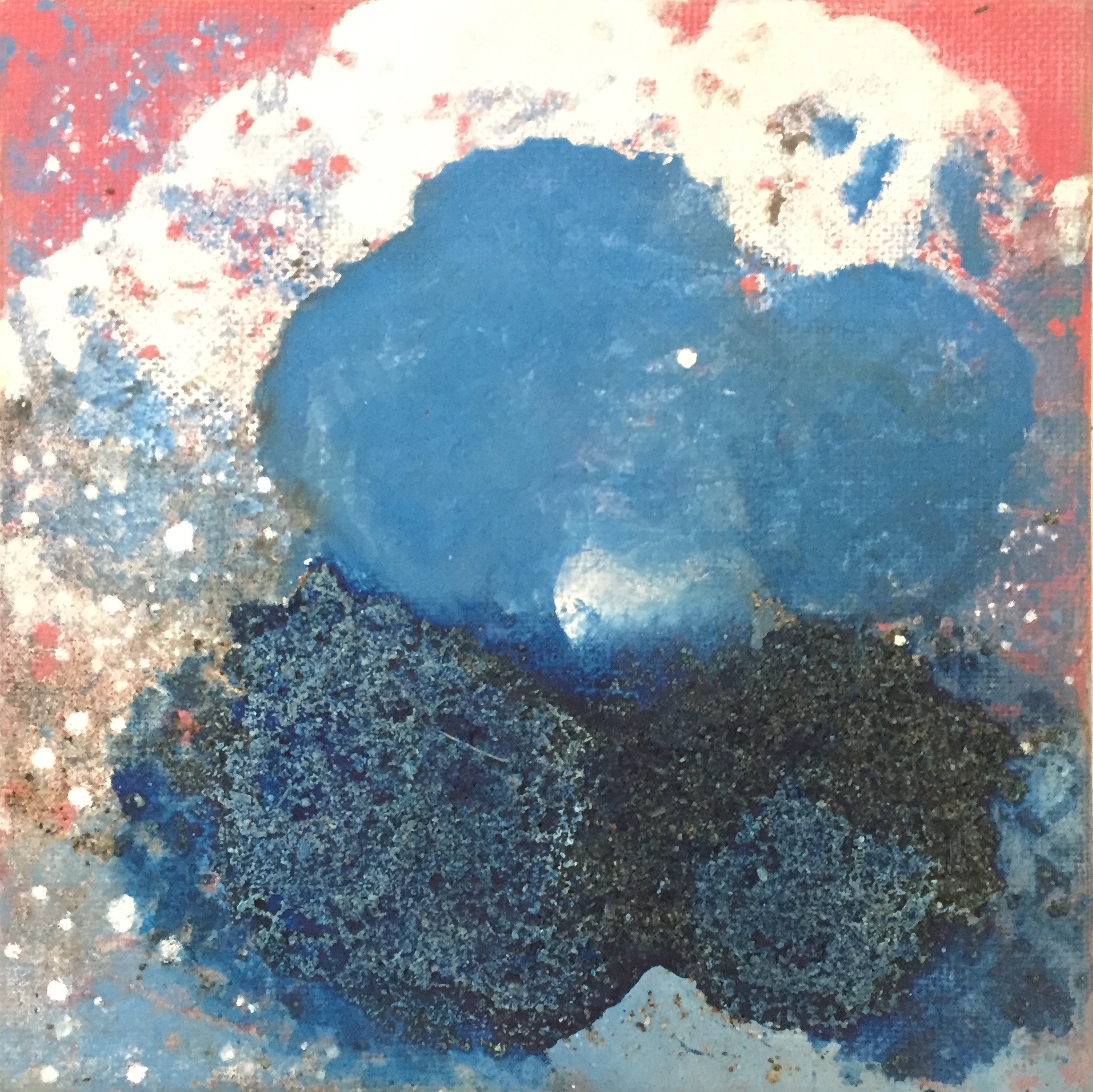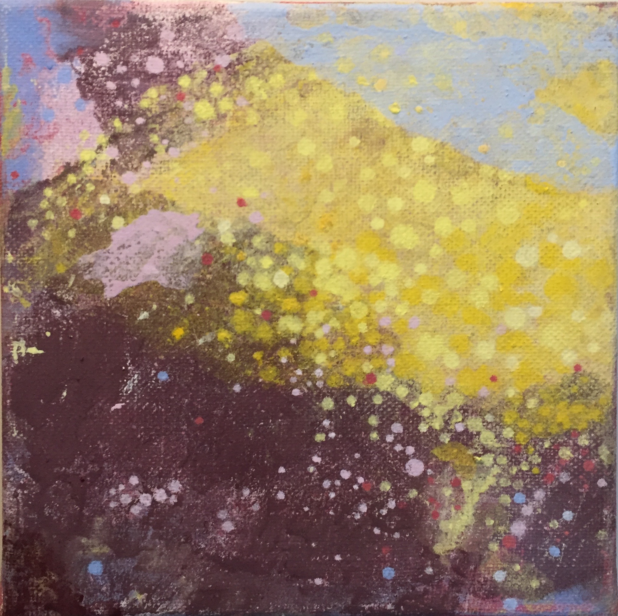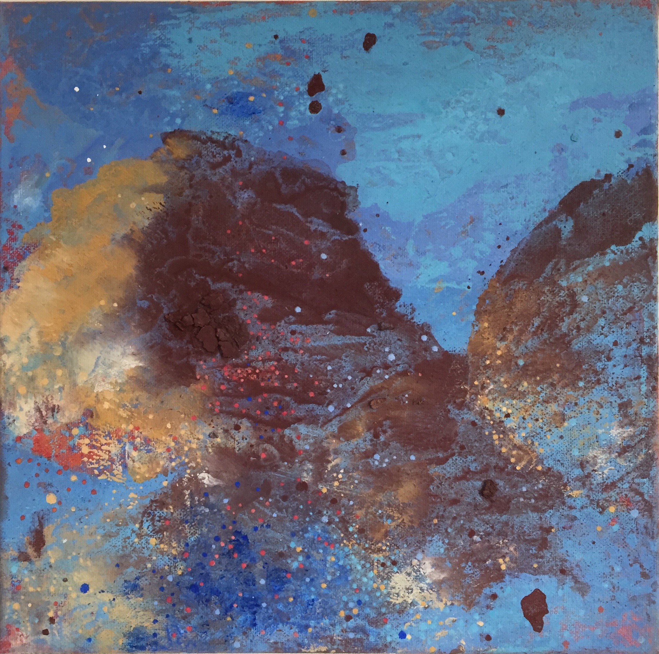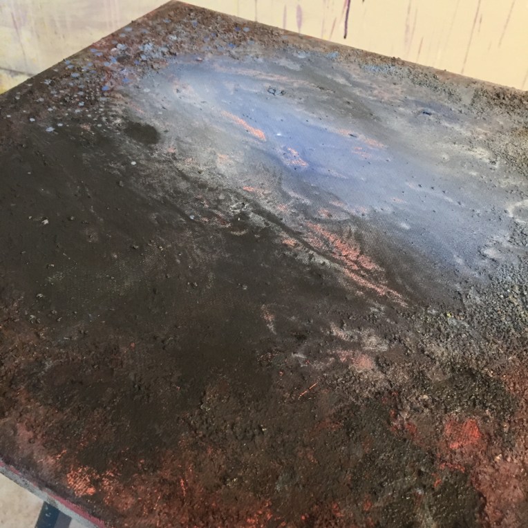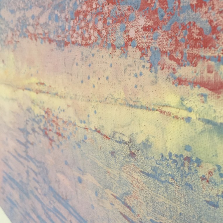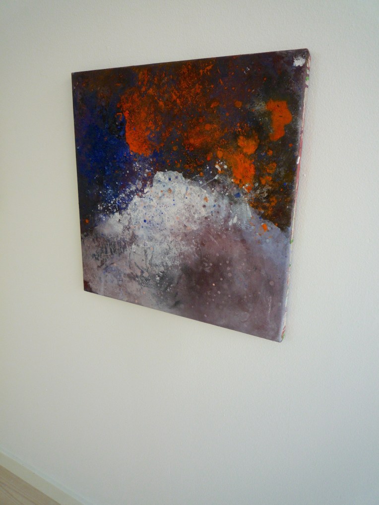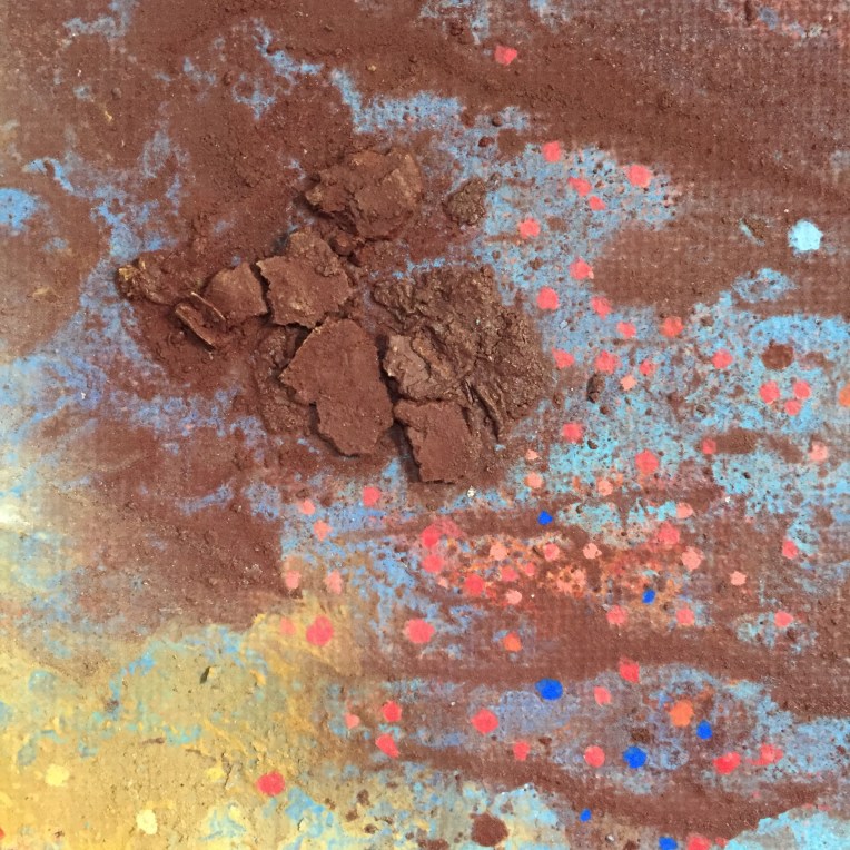 Tröst, 40×40 cm. Sand och frö av stickors i färgen. Målningen gör sig bra liggande.
