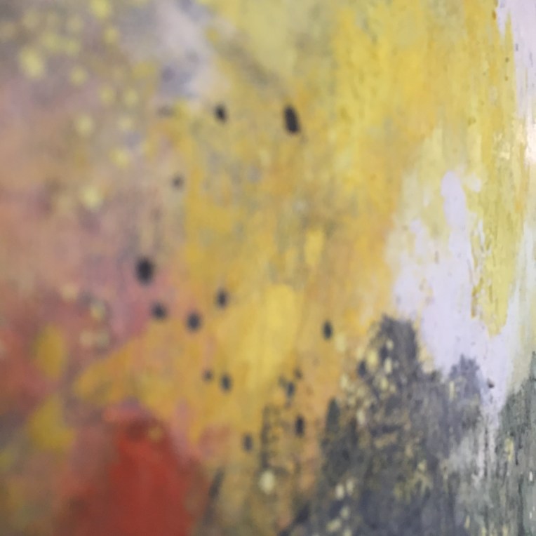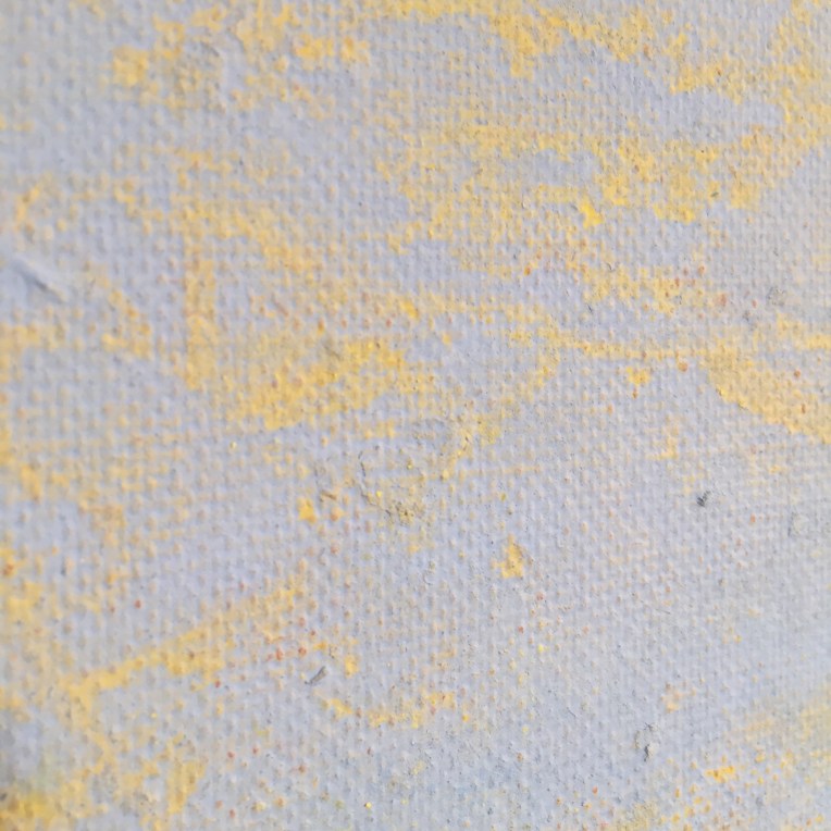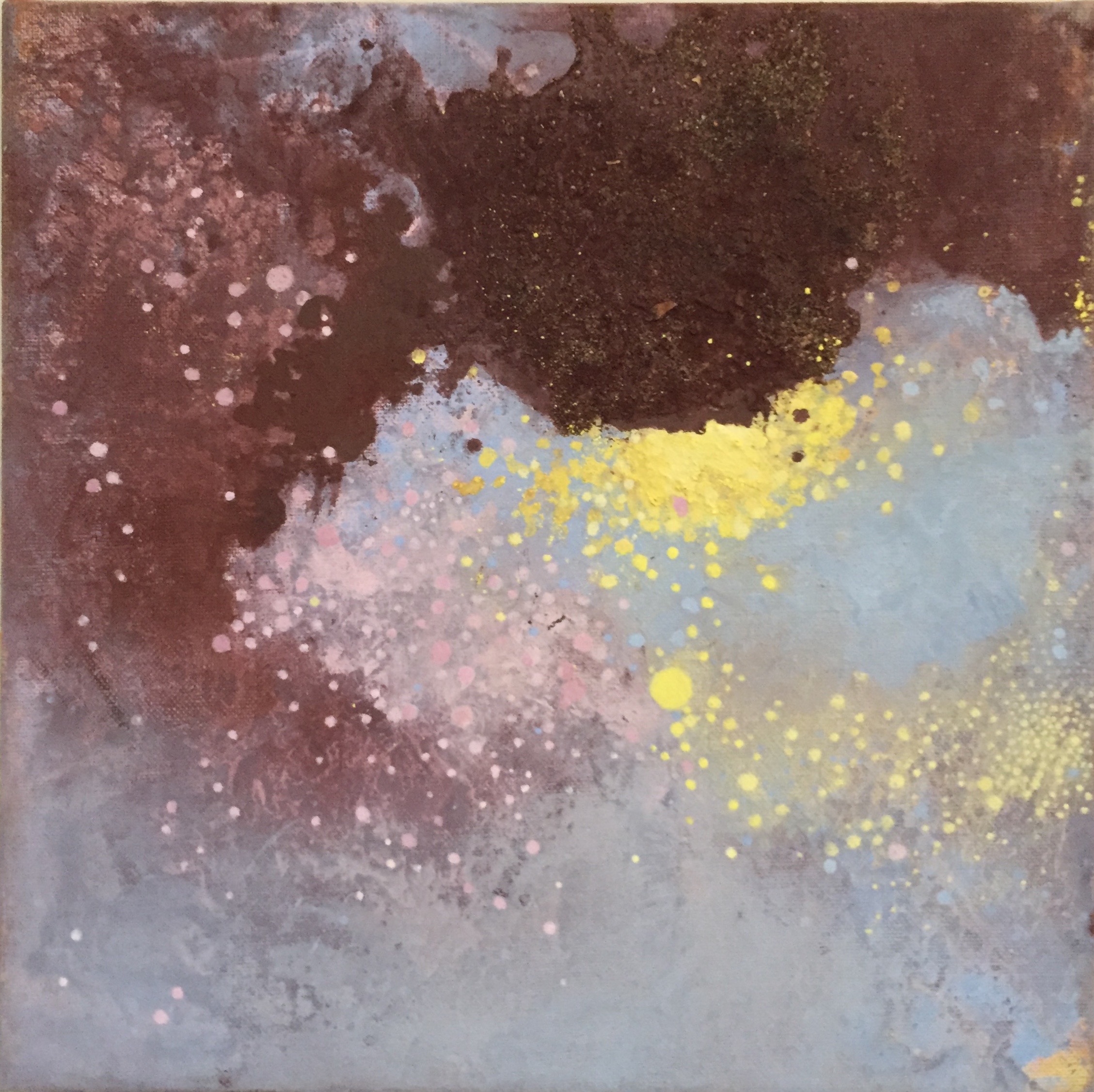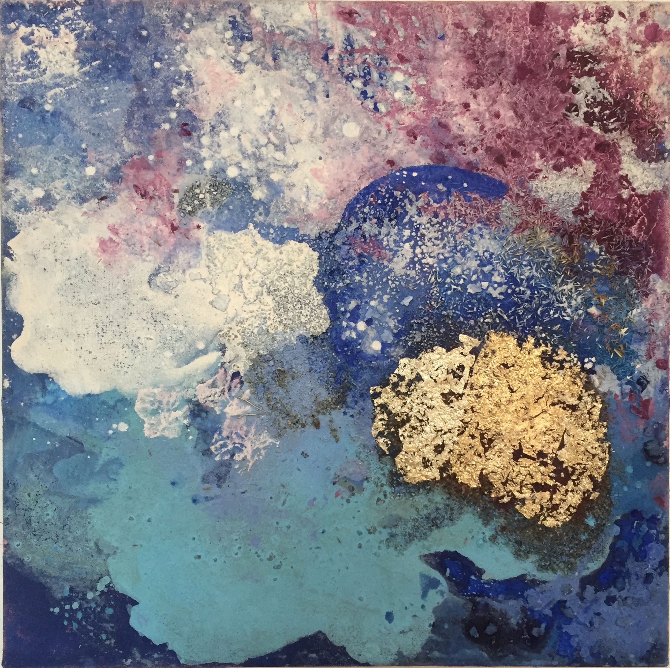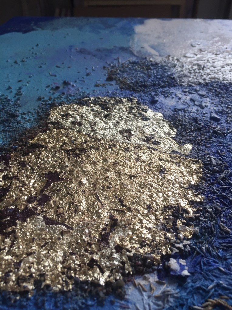 Sand II, 45×45 cm. Det ligger sand, gräsfrö och lite annat i färgen. Bladguld. Målningen gör sig bra liggande: