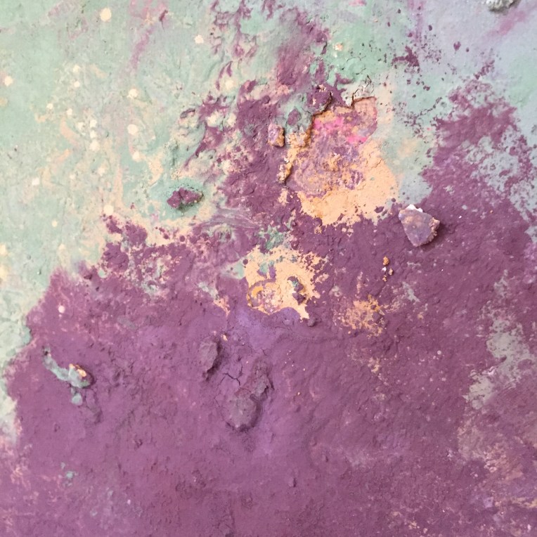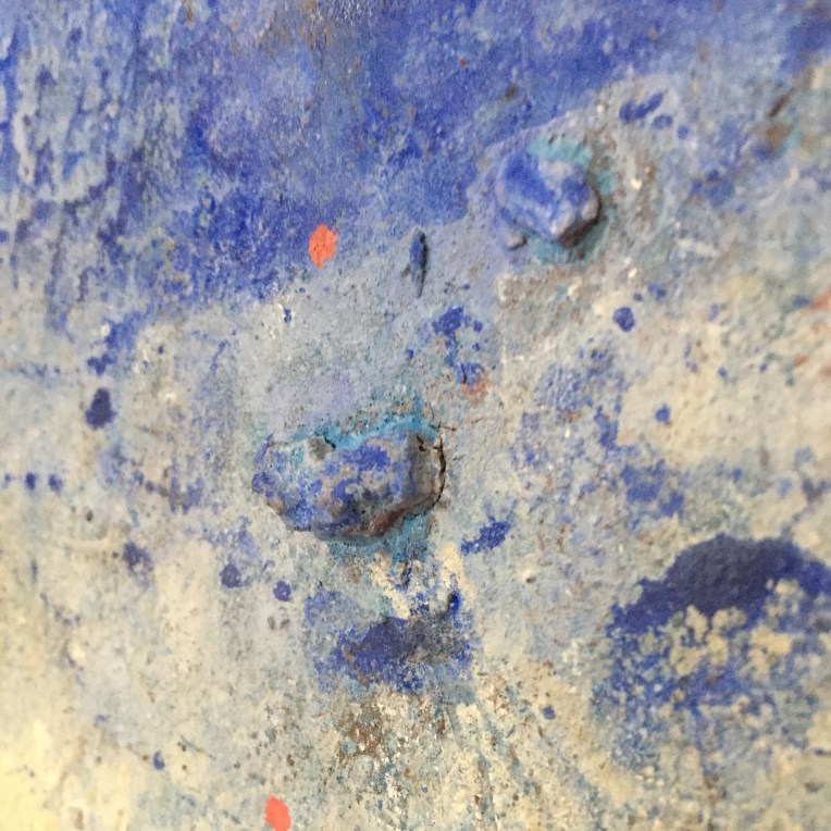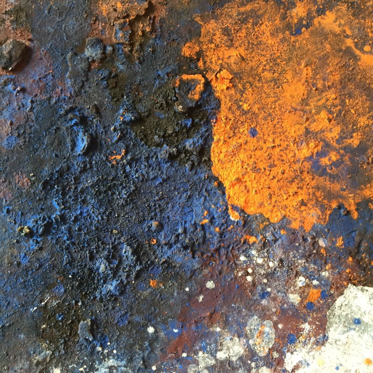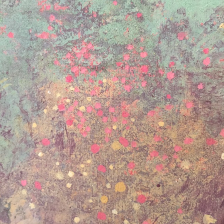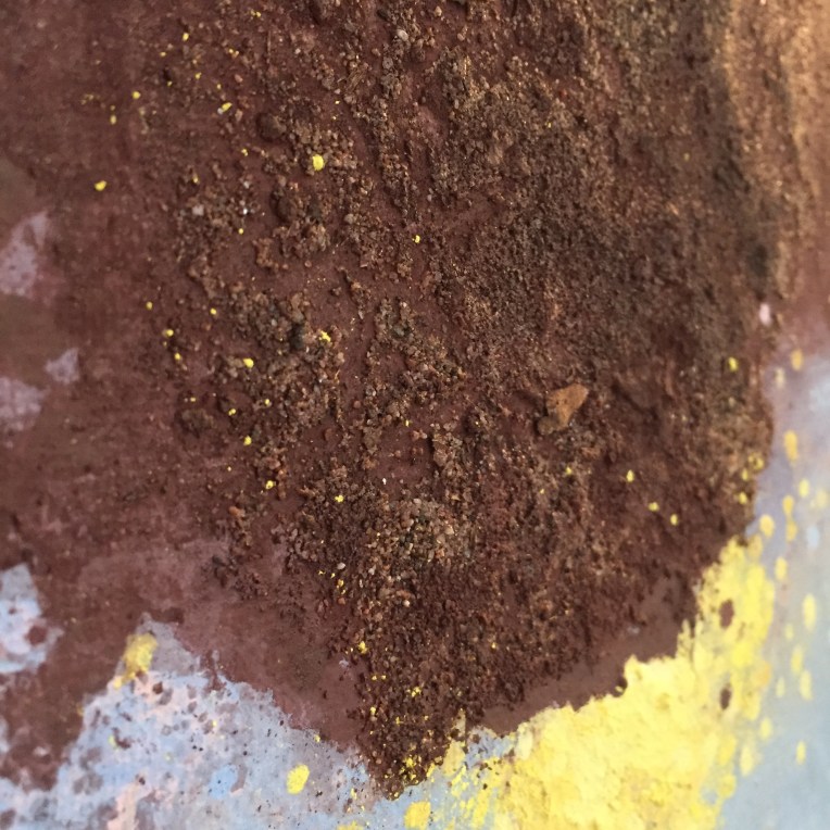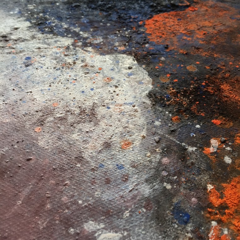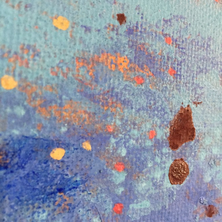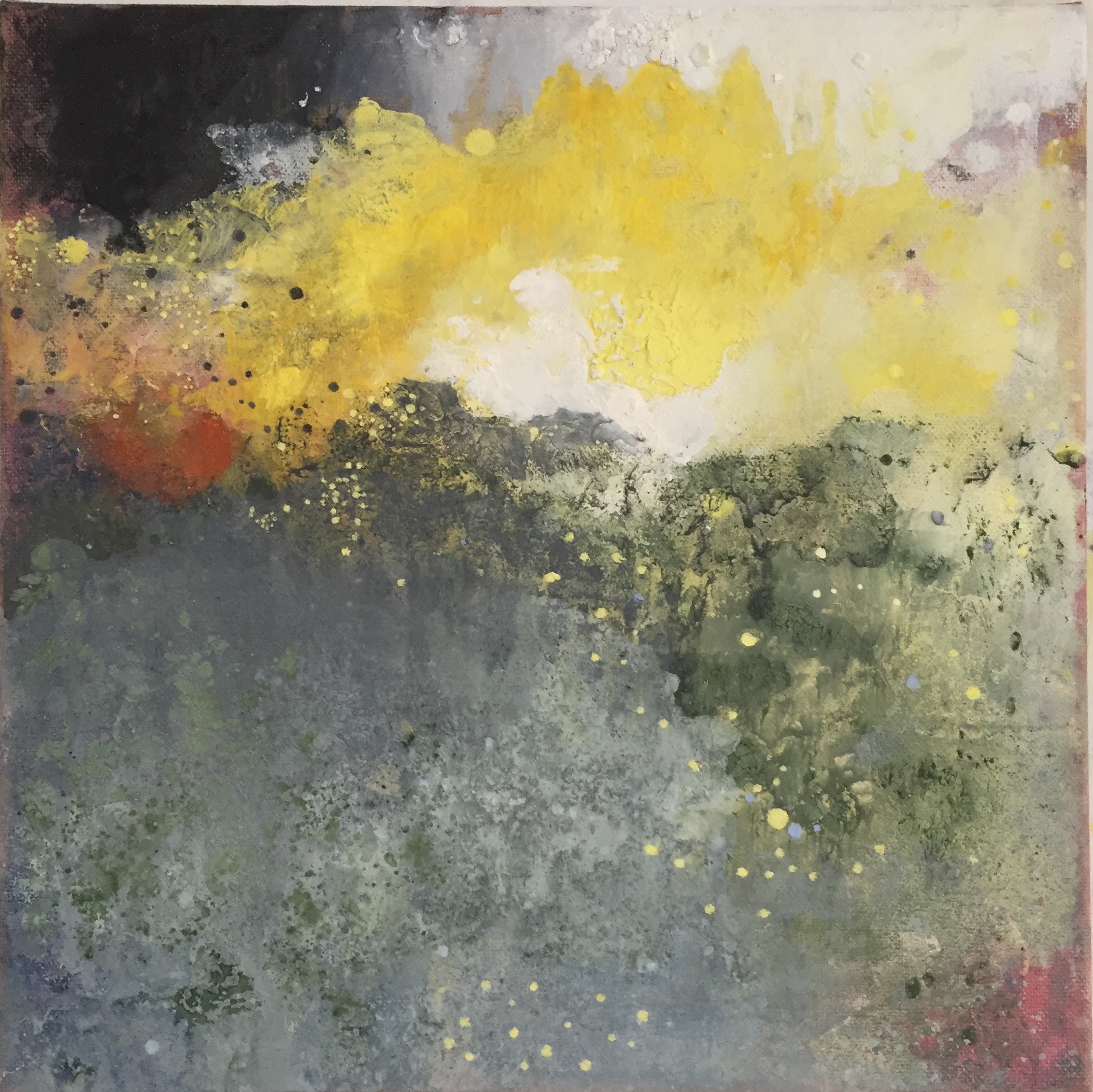 Sand II, 45×45 cm. Det ligger sand, gräsfrö och lite annat i färgen. Bladguld. Målningen gör sig bra liggande: