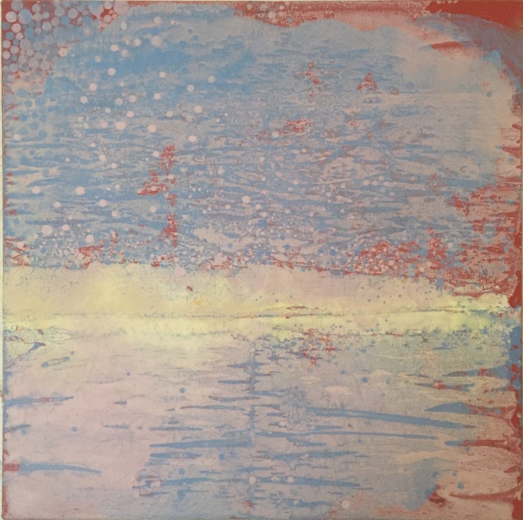 Sand I, 45×45 cm. Det ligger sand och vass i färgen. Målningen gör sig bra liggande.