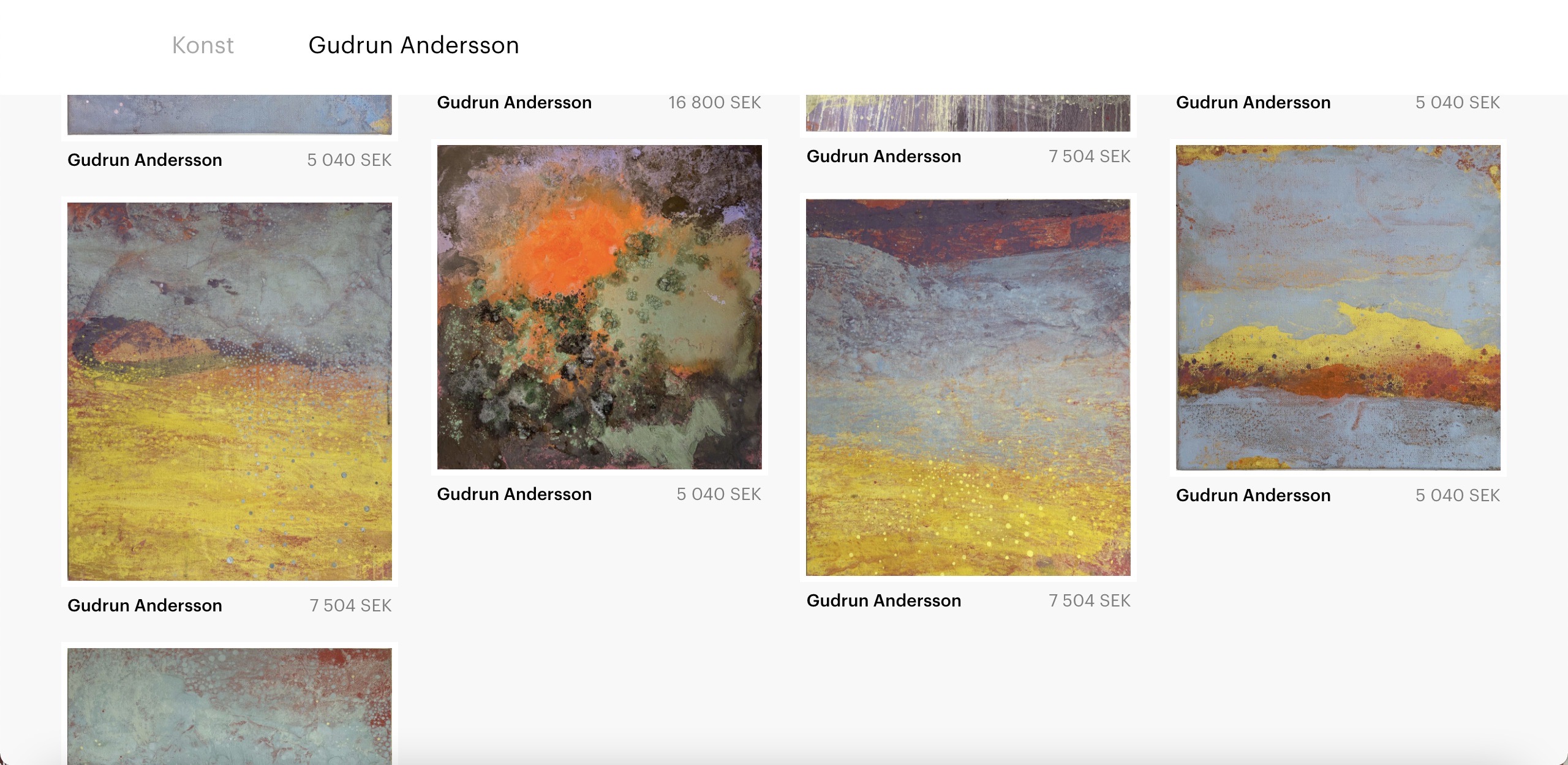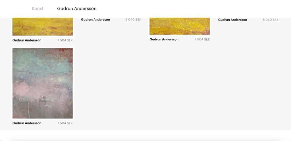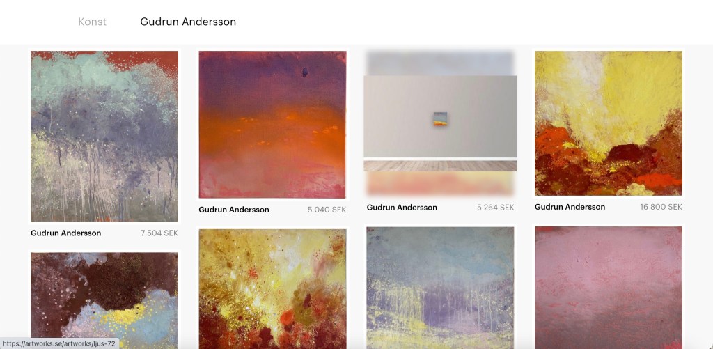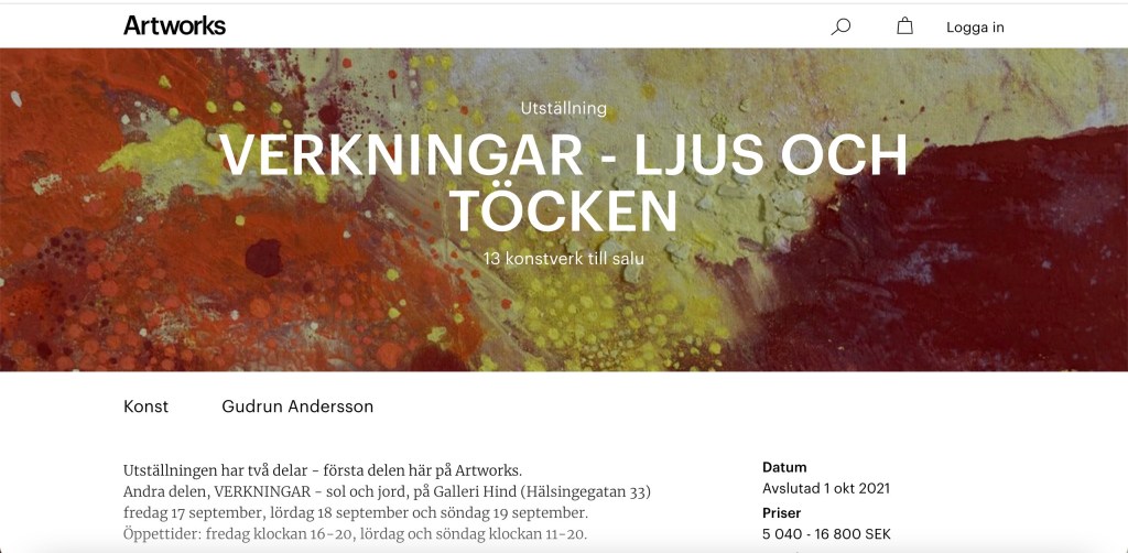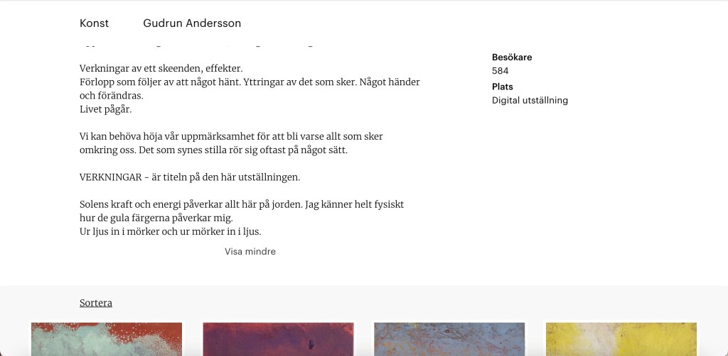 Verkningar – ljus och töcken Digital utställning på Artworks.se 28 augusti – 1 oktober 2021 Här kommer några skärmdumpar. Det är inte perfekt – men ger kanske en viss bild av hur det såg ut. Dela det här: Dela på X (Öppnas i ett nytt fönster) X Dela på Facebook (Öppnas i ett nytt fönster) Facebook Gilla Laddar in …